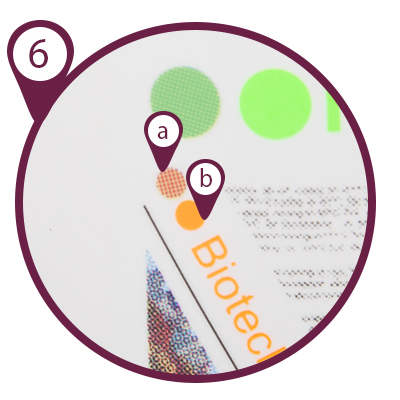 Comparison of colors achieved with CMYK (a) and Pantone (b) prints:
